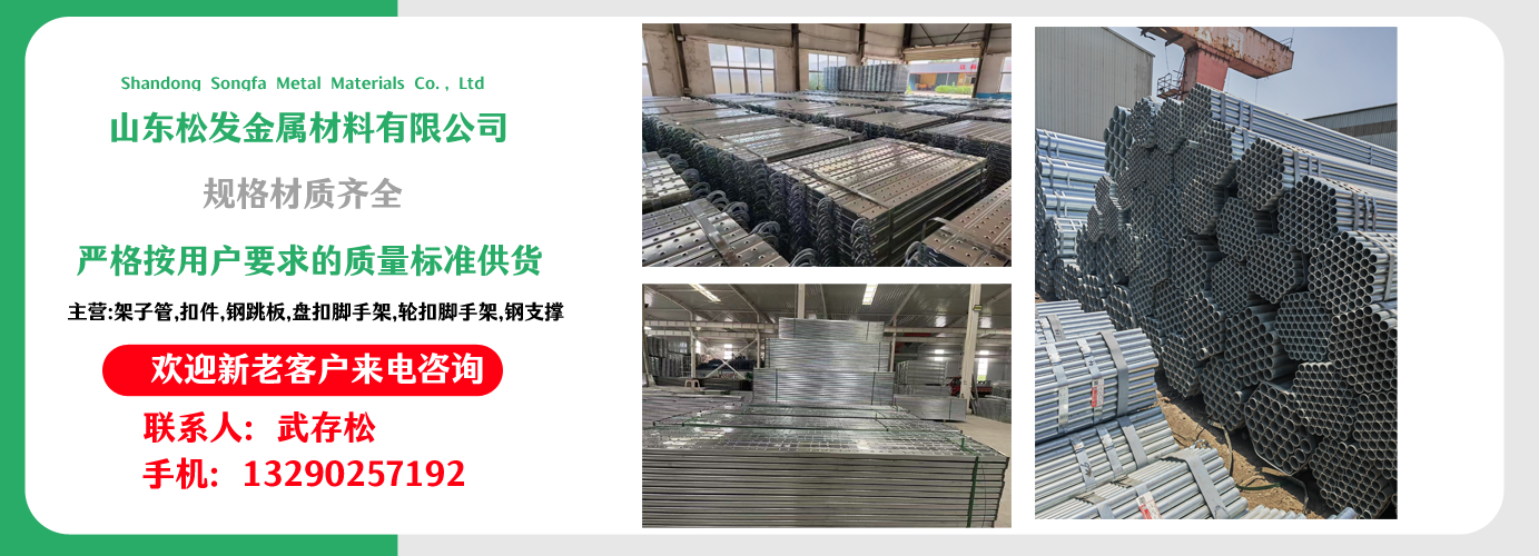 山東松發(fā)金屬材料有限公司主營架子管,扣件,鋼跳板,盤扣腳手架,輪扣腳手架,鋼支撐生產(chǎn)廠家。本廠專業(yè)生產(chǎn)銷售?! 〗ㄖ眉茏庸?、 主要用于房建,橋梁,鐵路,公路,地鐵,水庫,隧道,支撐?! 〖茏庸?扣件,鋼跳板,盤扣腳手架,輪扣腳手架,鋼支撐的優(yōu)越性及應(yīng)用“ ”產(chǎn)品因具有結(jié)構(gòu)簡單合理、設(shè)計(jì)巧妙、使用方便、安全、快捷、易于運(yùn)輸、儲(chǔ)存、維護(hù)簡單等特點(diǎn)?! 」疽回瀳?jiān)持“質(zhì)量,用戶至上,優(yōu)質(zhì)服務(wù),信守合同”的宗旨,憑借著高質(zhì)量的產(chǎn)品,良好的信譽(yù),優(yōu)質(zhì)的服務(wù),產(chǎn)品暢銷全球。歡迎廣大客戶來電洽談,共同發(fā)展,共創(chuàng)輝煌!  山東松發(fā)金屬材料有限公司秉承誠信服務(wù)、恪守信譽(yù)的宗旨,在同等的質(zhì)量下,保證以最低的價(jià)格,最完善的服務(wù),最高的信譽(yù)來答謝各界朋友的支持和厚愛,歡迎您的來電、咨詢,我們將竭誠為您服務(wù)!...